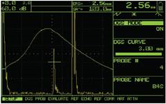 lDGS(距離增益尺寸)選項(xiàng)顯示了特殊等效參考缺陷尺寸曲線,作為測(cè)量25個(gè)窄頻探頭從探頭到參考缺陷距離的功能。ERS(等效參考缺陷尺寸)功能可自動(dòng)計(jì)算測(cè)量門內(nèi)任何回波的相應(yīng)等效參考缺陷的直徑(單位為毫米或英寸)。